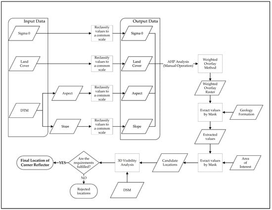 The determination of the criteria and constraints that are involved in the proposed methodology was based on the guidelines of the responsible institutions for GNSS (i.e., IGS, UNAVCO, EPN) and the latest scientific literature on CR installation. Consequently, the criteria were categorized and classified based on the importance of one over another, using MCDA. The latter includes the following two subprocesses: (a) the AHP analysis, which was used to derive ratio scales from the criteria, and (b) the WO analysis. The number of candidate locations was then substantially reduced by applying constraints based on significant parameters, such as the underlying geology, the area ownership (state land), and others. The result of the analysis is an extracted raster layer of the most suitable locations, categorized according to the degree to which they conformed to the specified criteria. Moreover, a 3D visibility analysis is also included in the process to finalize the selection of the most suitable locations. Hence, Line of Sight (LOS) and the distance between the two CRs were checked along with the inter-visibility and distance between the GNSS antenna and CRs (for the mitigation of unwanted multipath in GNSS observations). Finally, the average incidence angle for ascending and descending passes were also considered to account for the baseplate elevation angle of the CR. The flowchart of the semi-automatic suitability analysis procedure for the determination of CRs’ final locations is illustrated in Figure 2. Each step is analysed further in the following sections.