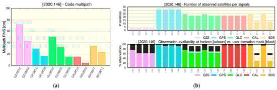 (a) Multipath graph at ALEV site for 24 h data acquisition, with an elevation cut-off angle of 0 degrees; (b) Observation availability of the tracked signals transmitted from each satellite at different elevation angles.