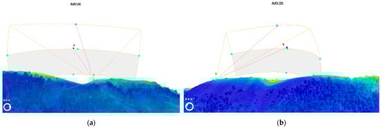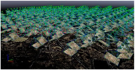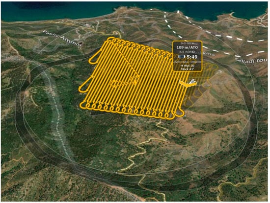 Consequently, the CyCLOPS team proceeded with the airborne mapping of the candidate areas in order to create high-resolution georeferenced 2D and 3D products. The fixed-wing eBee X was equipped with a GNSS receiver capable of measuring with the RTK method, achieving a centimetre-level accuracy without using ground control points and covering areas up to 500 hectares (5 Km2) in 90 min of flight. The UAV is equipped with senseFly SODA 3D mapping camera (sensor1″, RGB resolution 5472 × 3648 px (3:2)), which has the ability to change orientation during flight to acquire three images (one nadir, and two obliques) each time [], as shown in Figure 6. In this sense, it obtains a much wider field of view, ensuring excellent 3D mapping results in vertically focused environments; thus, it is suitable for large-scale aerial mapping.