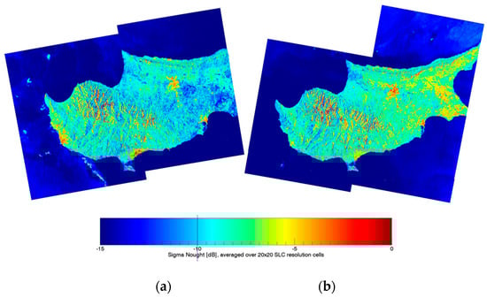 Sentinel-1 satellite mission is a near-polar, sun-synchronous orbit, performing C-band synthetic aperture radar imaging []; both ascending and descending pass directions are available in Cyprus. In particular, ascending refers to the satellite’s pass from South to North and descending from North to South, where observations are performed from West and East, respectively []. Hence, installing the CRs (one for each pass), the aspect direction of East is the most favourable value for the descending pass and West aspect values for the ascending. Flat areas having no downslope direction are also suitable for both passes.