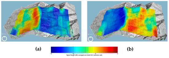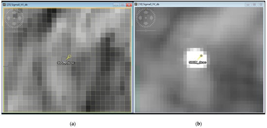The sigma 0 of the CR for the descending pass in the SOUN site. The RCS was calculated at 36.79 dBm2. (a) The backscatter coefficient before the CR installation and (b) after the CR installation.