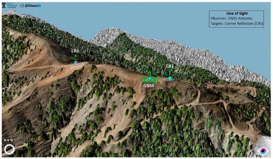 One of the major challenges faced in the establishment of CyCLOPS was the determination of the most suitable locations for the installation of sensors. Generally, the use of a GNSS CORS, in close proximity to artificial Persistent Scatterers (PS), such as CRs, serves as a valuable confirmation tool to the PS-estimated displacements []. However, the CRs should be installed in such a way, that the GNSS signal is not affected mainly by multipath. Moreover, the GNSS reference station, should be installed at sites that strictly adhere to strict guidelines set by world renowned services (IGS, UNAVCO, EPN), which require increased monument stability to isolate the station from surface soil movement and, thus, avoid the introduction of biases in the estimation of displacements.