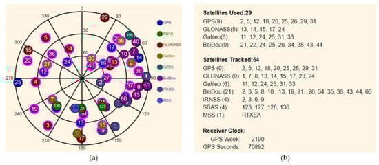 Satellite availability in ALEV GNSS permanent station. (a) The skyplot of the GNSS constellation; (b) The number of satellites tracked and used by the GNSS receiver.