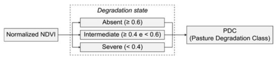 The PDI was calculated for each rural property with a minimum pasture area of one hectare and occupying more than 10% of the property. This criterion was used to analyze only properties with effective livestock activity. The property boundaries were obtained from the CAR (Rural Environmental Registry) database of the Brazilian forestry service, which, in the period of analysis, consisted of 5.5 million rural properties. To calculate the PDI, we considered the four classes of degradation state as proposed by Andrade et al. [37]. The PDI varies between 1.0 and 4.0 and was calculated according to Equation (3), as follows: