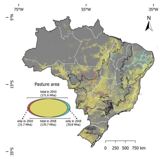 Areas occupied by pastures in Brazil in 2010 and 2018 (http://atlasdaspastagens.ufg.br/ accessed on 17 December 2021) (31.7 Mha (million hectares) mapped only in 2010; 139.9 Mha mapped in 2010 and 2018; 30.8 Mha mapped only in 2018).
