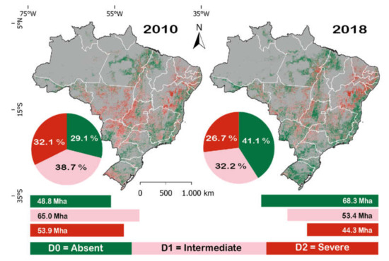 Pasture area in Brazil, according to 3 classes of degradation state (D0—Absent; D1—Intermediate; D2—Severe), for the years 2010 and 2018.