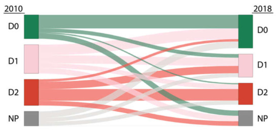 The temporal dynamics of each degradation class contributed to verifying precisely the changes between pasture quality states over time (Figure 4). Almost half of the area classified as D0 in 2010 (42.9%) changed its degradation class in 2018. We observed that 15.8% went to D1 and 4.9% went to D2, indicating a loss of quality in both cases. Another 22.3% were classified as NP. On the other hand, the increase in area and percentage observed in the D0 class in 2018 was due to the improvement in quality in areas coming from D1 (31.9%) and D2 (7.3%), but also due to the change in land use, as 19.9% came from NP.