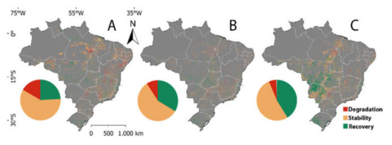 The retraction in pasture areas occurred mainly in the central west and southeast regions of the country, while the expansion was detected predominantly in the north region. Such spatial dynamics is intrinsically linked to the processes of land use and occupation prevalent in the country [9,45,46]. The pasture retraction areas were occupied by agriculture (i.e., soy, corn, cotton and sugarcane), predominantly in the Cerrado and Atlantic Forest biomes. On the other hand, the expansion took place in areas of conversion of native vegetation, mainly in the Amazon biome [26].