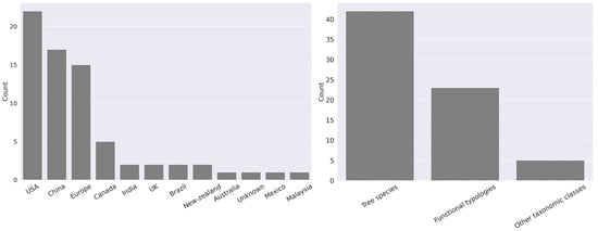 The number of papers fulfilling the criteria of our review study has been steadily increasing between 2000 and 2021 (Figure 1). Most urban mapping studies included in this review have been performed in the USA, China and Europe (Figure 2). An important number of these studies focus on the mapping of tree species, while fewer studies focus on other taxonomic classes or functional vegetation types (Figure 2). The mapping itself is done using various types of data sources (spectral data, LiDAR) mounted on different platforms (airborne, spaceborne, terrestrial) and using various mapping approaches. Each of these dimensions will be explored in this review to give a coherent overview of the evolution and current practices in the field.