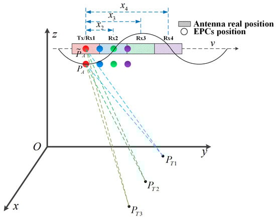 The geometric relation of multichannel HRWS SAR system with motion errors is illustrated in Figure 1. The y-axis denotes the platform movement direction, and its velocity is v. and represent targets at different positions in the observation scene. The system shown in Figure 1 has four channels, in which Tx is used as a transmitter, and Rx1, Rx2, Rx3, and Rx4 are used as receivers to simultaneously receive echoes in each pulse repetition period. According to the principle of the equivalent phase center [], the EPCs are located in the middle of the transmitter and receivers, which are shown as dots in Figure 1. The dashed line indicates the platform trajectory without motion errors, and the EPCs are represented as . The solid line indicates the platform trajectory with motion errors, and the EPCs are represented as .