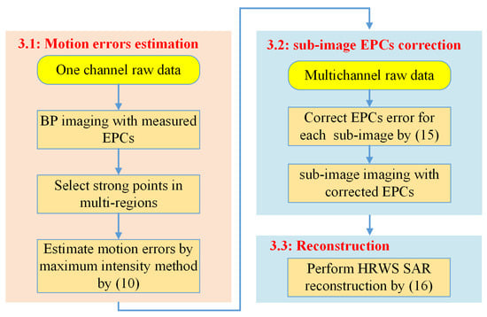 To overcome the abovementioned two drawbacks of the existing SAR motion errors compensation methods, a high-precision motion errors compensation method based on sub-image reconstruction (SI-MEC) for HRWS SAR imaging is proposed. The proposed method consists of three steps. Firstly, coarse imaging with motion errors is performed and strong points in partial regions of the coarse imaging result are selected. The motion errors of the platform are estimated by maximizing the intensity of the strong points. Secondly, according to the estimated platform motion errors and the multichannel geometry, the EPCs used for sub-image imaging are corrected and the sub-images imaging is performed before reconstruction. Thirdly, the reconstruction is performed by using the sub-images.
