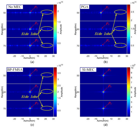 In Table 2, the azimuth peak sidelobe ratio (PSLR) and azimuth integrated sidelobe ratio (ISLR) are listed. First, we compared the performance of the same method at different ranges. The PSLR and ISLR of PGA were the smallest at 50 Km. It can be seen that PGA could only improve the image quality at 50 Km. The PSLR of BP-FMSA was almost the same at 50 Km, 60 Km, and 70 Km. However, the ISLR of BP-FMSA at 70 Km was higher than other places. This shows that BP-FMSA improved the image quality at 50 Km, 60 Km, and 70 Km, but its performance dropped at 70 Km. The PSLR and ISLR of SI-MEC were almost the same at 50 Km, 60 Km, and 70 Km. This shows that SI-MEC improved the image quality of all pixels in range direction.