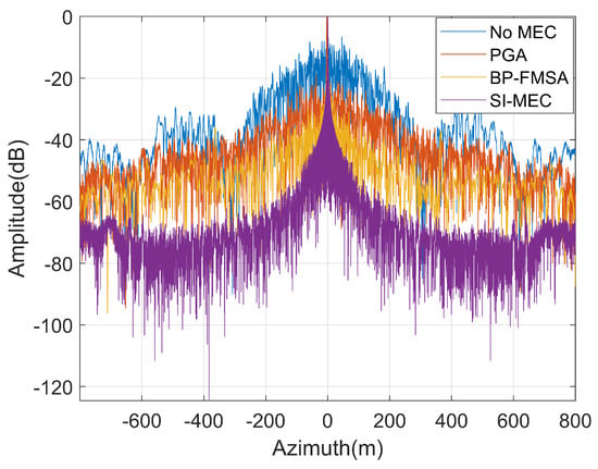 We compared the image quality of the targets at the same range, shown in Figure 4a–d, and we found that the proposed method had better performance in the azimuth direction. Moreover, Figure 5 shows the azimuth profile of the point target at 50 Km by different methods in Figure 4. It indicates that compared with the other two methods, SI-MEC could effectively suppress the side lobe level. The proposed method improved the imaging quality in the azimuth direction.