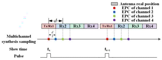 Assuming that the imaging scene can be approximated by discrete pixels, the position of each pixel can be expressed as . Let denote the position of the measured EPCs of channel n at slow time . The backprojection (BP) algorithm is employed to process the uniformly sampled echo signal, whose principle has been presented in the literature []. According to the BP algorithm, the filtered BP component of the m-th pixel at slow time can be expressed as
