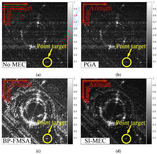 PGA and BP-FMSA utilized a local area, which is marked by orange boxes in Figure 7b,c, to estimate the compensation phase. This compensation phase mainly improved the imaging quality of the selected area. Imaging results in other areas of the scene had higher sidelobe levels. For BP-FMSA, because the selection of the dominant scatter region affects the performance of the imaging [], we presented the optimal results under the current experimental conditions. For the proposed method, strong points in two local areas were selected as the input of the estimation. The areas are marked by orange boxes in Figure 7d. We can see that not only the selected area was focused, but the imaging quality of the whole scene was improved. This demonstrates that the proposed method improved the image quality of the whole scene.