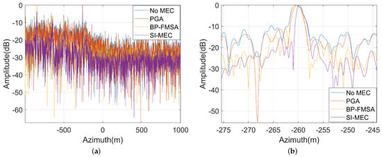 Figure 8 shows the enlarged imaging results of the building and the point target in Figure 7, which are marked by red boxes and an orange circle, respectively. We can see that it was difficult for PGA to compensate for the severely defocused multichannel SAR image, and BP-FMSA could not suppress the sidelobe level well. The sidelobe level of the imaging results by SI-MEC was significantly suppressed. This shows that the proposed method was better in terms of imaging quality in the azimuth direction. Figure 9 shows the azimuth profile of the point target in Figure 8 by different methods. It shows that the proposed method has a lower sidelobe level compared to other algorithms.