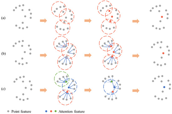 The illustration of three different representative methods: (a) PointNet ++; (b) DGCNN; (c) our proposed AGM. In the last row, points of different colors have different attention scores, and we used attention pooling in the last step, which is different from the two max-poolings above.