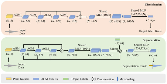 AGNet architecture for classification (top) and segmentation (bottom). The point features were processed into high-level geometric feature learning in cascaded AGMs. Next, we used the max-pooling results, as well as fully connected layers to obtain the class scores.