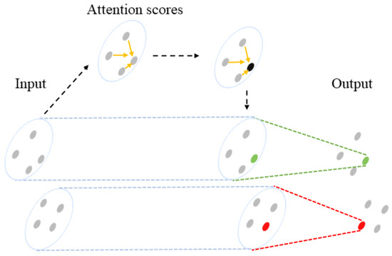 Attention pooling was used to aggregate the set of neighboring point features . The illustration of attention pooling is shown in Figure 4. Existing methods generally use max-pooling to aggregate the neighboring features, and a large amount of the information thus is lost. The attention mechanism can solve this problem well, and we used the attention mechanism to automatically learn the most important features. In fact, the attention pooling mechanism can be defined as follows. Firstly, we computed the attention scores. Given the set of local features , we designed a shared function to learn a unique attention score for each feature. Basically, the function consists of a shared MLP followed by . It is formally defined as follows: