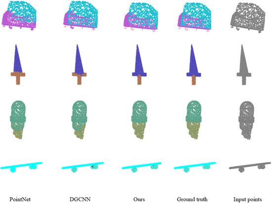We evaluated our network with the category mean intersection-over-union (mIoU) and the instance mIoU and compared the performance with other methods. We evaluated our network with the same scheme as PointNet: We averaged the IoUs of each part of a shape. The IoUs of a category can be computed through the mean value of the IoUs, all of which belong to this category, which can be obtained one by one through the approach above. Finally, we averaged the IoUs of all shapes that were used for testing to obtain the mean IoU. We compared the performance of our network with PointNet, PointNet++, the DGCNN, SO-Net, the PCNN, and some others. The results of the segmentation are in Figure 5. We also visualized the results of our comparison with PointNet and the DGCNN.