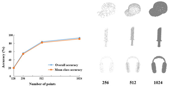 Robustness test: In addition, we verified the robustness of our model by using the classification network with k = 20. We gradually reduced the number of input points step by step from 1024 to 512, 256, and at last only 128 points input into the model, which was trained in the same way as the object classification part. Figure 8 shows the overall accuracy and mean class accuracy results of the experiment with different numbers of input points. It is obvious that our model achieved a considerable overall performance with 1024 points, and even if the data were reduced to half of the original, which was only 512 points, the model still performed well, which proved the robustness of our model. It is worth noting that if we continued to reduce the input points by the same proportion, the accuracy of our model would decline sharply and could not maintain good robustness. This is because the k value set by our model was 20, that is, for each input point to be predicted, we would find its nearest 20 neighbor points. While there were too few input points, the model could not extract the corresponding graph-like features through the k-nearest neighbor algorithm, which led to the model being unable to find a good topology to characterize the main features of the shape. Accordingly, if the extracted graph structure had a low effect, even if the attention pooling strategy was used, the more important feature could not be extracted from a large number of invalid features.