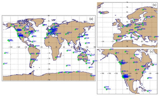 Maps of the 118 IGS stations for which data are available from 1995/1996 to March 2011. (a) Global map, (b) zoom in on Europe, (c) zoom in on North America.