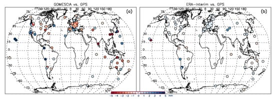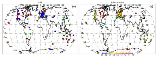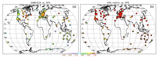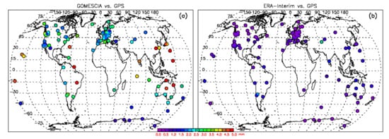 Figure 4 shows the standard deviations of the mean differences between GOMESCIA or ERA-Interim and GPS IWV that were presented in Figure 3. Bock and Parracho [36] demonstrated that this variable is a very useful metric for representativeness errors between ERA-Interim and GPS IWV. The average value over all sites is smaller between GPS and ERA-interim (0.8 mm) and larger between GPS and GOMESCIA (2.7 mm). This is caused by the larger spatial area around the GPS site covered by GOMESCIA compared to ERA-Interim, and the resulting larger spatial representativeness errors between GOMESCIA and GPS IWV compared to ERA-Interim and GPS IWV. However, a difference in temporal sampling may also play a minor role here, as the GOMESCIA IWV retrievals are not exactly temporally coincident with the GPS observations at the site locations. As such, diurnal IWV variations [20] and differences in cloud cover at both observation times might contribute to a larger variability of the GPS-GOMESCIA IWV differences, compared to GPS-ERA-Interim. The spatial distribution of the standard deviations of the differences in Figure 4 illustrates a slight latitudinal variation, with the largest values mainly obtained between GOMESCIA vs. GPS IWV at tropical island and coastal locations.
