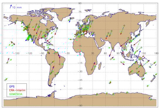 The linear trends for the different datasets are shown in Figure 10 for the period of January 1996 to December 2010. It can be seen that the overall agreement of the trends is relatively good. Around two-thirds of the GPS sites have positive trends (23 sites with statistically significant positive trends), whereas this is only true for 55% for GOMESCIA IWV time series (9 sites with statistically significant positive trends). For ERA-Interim, this percentage amounts to 60% (12 sites with statistically significant positive trends). In none of the data sets is the number of sites with statistically significant negative trends larger than 5. As such. there is an overall tendency for positive IWV trends, rather than negative trends, resulting in trend magnitudes, averaged over all stations, of 0.18 mm, 0.08 mm, and 0.11 mm decade−1, for GPS, GOMESCIA, and ERA-Interim, respectively. The mean GPS IWV trend magnitude is very close to the 0.26 mm decade−1 GPS IWV trend as observed by Wang et al. [20], based on a similar IGS dataset. The correlation coefficients between the IWV trend values of the different datasets at the different sites are comparable, with values R2 = 0.66, 0.63, and 0.57 between GPS vs. ERA-Interim, ERA-Interim vs. GOMESCIA, and GPS vs. GOMESCIA, respectively. Trend differences are expected between all-sky IWV datasets (GPS and ERA-Interim) and clear-sky datasets (GOMESCIA), see [9] (their Figure 4).