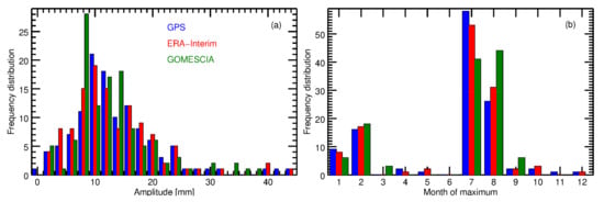 Frequency distribution of (a) the amplitudes and (b) phases of the seasonal cycle in the monthly mean IWV time series of GPS (blue), ERA-Interim (red), and GOMESCIA (green) at the location of the 118 IGS sites. As the sites of our sample are not homogeneously distributed around the globe, the shapes of those histograms do not reflect global climatological characteristics.