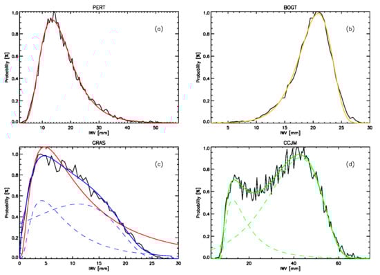 From the GPS and ERA-interim IWV time series (available with a 6 h temporal resolution), an IWV frequency distribution was calculated. For each site, a non-linear least squares fit to compute Gaussian, lognormal, and bimodal (two lognormal) distribution functions through those IWV frequency distributions were calculated. For the lognormal distribution function, the same formula as in Foster et al. [14] was adopted and described by three parameters: the median M, the geometric standard deviation (GSD) s, and a threshold parameter t, allowing for a non-zero lower bound (standard lognormal) or even a distribution bounded by an upper value t with the long tail tending towards zero (reverse lognormal). In this latter case (Figure 7b), the upper value t corresponds to the maximum atmospheric moisture capacity in case of complete saturation.