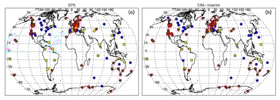 In this paper, we use homogenously reprocessed ZTD data provided by the International GNSS Service (IGS) [25] Repro1 campaign [26], available for about 400 GPS stations from 1995 until April 2011. From this worldwide dataset of almost continuous and homogeneously reprocessed ZTDs, we selected the 118 IGS stations having the longest time series (16 years—see Figure 1 and Table S1 of the supplementary material). Although homogeneously reprocessed, the IGS ZTD time series can still contain discontinuities or break points due to unreported or mis-modelled instrument changes or changes in the observation statistics [27,28]. While those remaining inhomogeneities might impact trend estimation [12], a statistical homogenization of this dataset is out of scope for this paper; a benchmark study of different break detection methods on synthetic datasets created from the same GPS and ERA-Interim IWV time series is presented in Van Malderen et al. [29].