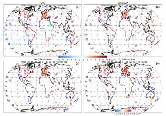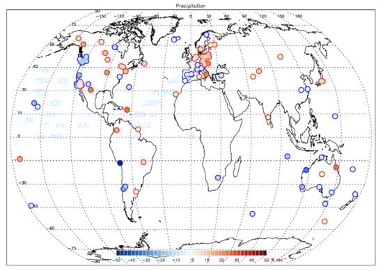 Finally, trends in precipitation at the site locations were also calculated, as shown in Figure 11. The precipitation data were sampled to the sites from a monthly gridded precipitation dataset [46]. This dataset originates from National Meteorological and Hydrological Services and other external agents and is produced using angular-distance weighting interpolation from the monthly observational data. The spatial pattern of the sign of the precipitation trends overall follows the IWV and surface temperature trend signs, i.e., negative trends in Western Australia and the Pacific coasts of the Americas, and positive trends over continental Europe. The considered time series of surface temperature, IWV, and precipitation therefore seem spatially and temporally correlated with each other, as already highlighted in different studies, e.g., [2,47]. Although water vapor increases globally at a rate close to 7% K−1 with surface warming (as per Clausius-Clapeyron), precipitation increases only with 1 to 3% K−1 [1,48,49,50] according to energetic constraints [50]. Regional moisture divergence/convergence and dynamics also affect the precipitation–temperature–water vapor linkage.