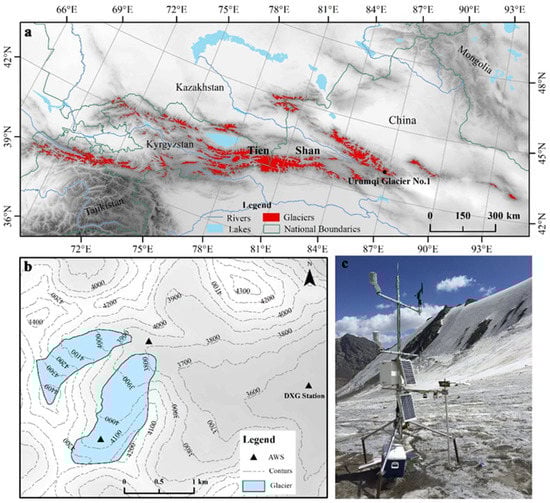 Geographical location of Urumqi Glacier No.1 in Tien Shan, China, (a) and the positions of the three automatic weather stations (b). The picture of an on-glacier AWS taken on 15 August 2019 represents the bare ice surface during the ablation period (c).