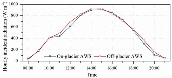 The effect of surface slope is very limited because the surface slope is about 2° at the AWS site. The sensor tilting can be caused by the glacier surface movement, differential ablation, or accumulation. Considering that the radiation senser was horizontally installed within ±0.2° near the glacier’s ELA, the mass balance at the AWS site during the measurement period was close to 0 m w.e., and the trigonal mast was drilled into a depth of about 2 m below the glacier surface (Figure 1c), the sensor tilting resulted from surface melting can be negligible. Moreover, the AWS was visited and maintained every week during the ablation season (May–August), and once a month from September to the following April to ensure the normal operation of the AWS and the horizontality of the sensors. In addition, a second AWS was set up in the east branch glacier forefield in 2011 and remains operational (Figure 1b). The off-glacier AWS was equipped with Kipp and Zonen CNR1 four-component radiometers, with a spectral range of 0.35–2.50 µm for the shortwave radiation. Because the off-glacier AWS is horizontally placed on a platform of reinforced concrete on the terminus moraines, the incoming shortwave radiation value measured by the sensors can therefore be regarded as realistic. Comparing the mean diurnal cycles of incoming shortwave radiation under clear sky conditions reveals that the observed diurnal trend at the on-glacier AWS is similar to the off-glacier AWS (Figure 3), which gives us further confidence that the sensor maintained horizontality over the study period.