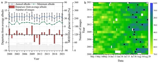 (a) The average albedo, minimum albedo, departures from average albedo, and number of images for Urumqi Glacier No.1 during the ablation season between 2000 and 2021. (b) Daily albedo of Urumqi Glacier No.1 during the ablation season from 2000 to 2021. The black dots show the timing of minimum albedo.
