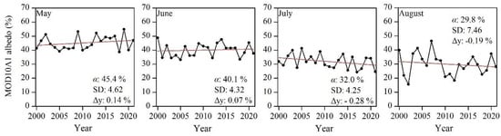 Overall, a slight decreasing trend for mean ablation-period albedo was shown from 2000 to 2021, with a total decrease of 1.87% or an annual mean decrease of approximately 0.085%. Furthermore, the glacier surface albedos in 2000–2021 showed distinct variations in different months, as shown in Figure 6. The average linear slopes for May and June were positive, suggesting increasing albedo values in early summer. In July and August, a negative trend was shown, implying that more incoming shortwave energy is absorbed at the surface during these months with lower albedo. It is, however, noted that these trends were not statistically significant at the 95% confidence level (the whole ablation period, p = 0.4; May, p = 0.36; June, p = 0.67; July, p = 0.07; August, p = 0.47).