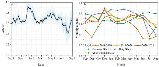 (a) The seasonal variation in surface albedo for Urumqi Glacier No.1 between September 2018 and August 2021 presented as mean 5-day values, and the darker and lighter shaded areas indicate the standard error and standard deviation, respectively, of the set of observations used to compute the mean. (b) Comparison of seasonal variation in surface albedo between the Urumqi Glacier No.1, Morteratsch Glacier, Brewster Glacier, and Haig Glacier. Details of these glaciers are shown in Supplementary Table S1.