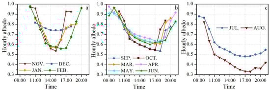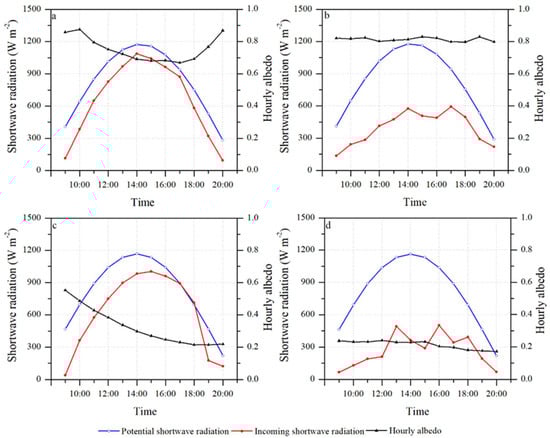 To investigate the diurnal cycles in the surface albedo under clear sky conditions, clear-sky days were identified by dividing the measured incoming shortwave radiation by the potential direct shortwave radiation at the top of atmosphere that can be approximated from solar geometric relationships [39,40].