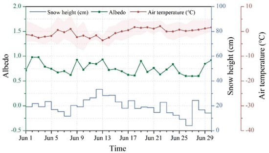 Daily mean values of surface albedo, air temperature, and snow height at the glacier AWS site in June 2019. The light red shadows around the mean air temperature indicate the highest and lowest air temperatures.