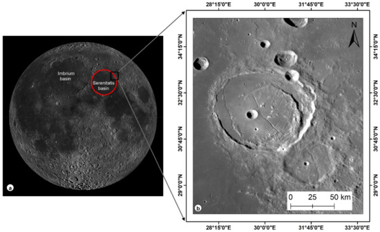 Posidonius is a floor-fractured impact crater in the north-eastern part of the Serenitatis basin main rim, with a latitude and longitude of 35°20′0″N, 27°20′0″E and 28°0′0″N, 33°30′0″E, as shown in Figure 1. Analysis of the Apollo 17 felsic clast of breccia rocks and age dating concluded that the Serenitatis impact event occurred ~3.87 ± 0.04 Ga [39,40], which is near to the age (time period) of the Imbrium impact event (3.85 Ga). The Serenitatis crater displays mass concentrations (Mascon) inside it and is filled with several series of magmatic activities [41,42,43]. Multi ring transition from complex craters occurs during impact events of more than 100 km [2]. The pre-impact morphology and present fracture system of the Posidonius crater is influenced by the Serenitatis impact. A wide moat is observed between the floor and the inner wall, with sinuous rilles in the moat of lava. The Posidonius floor is vested with the fracturing of grabens and a central peak ring. The significant and unique morphology of the study region led it to be chosen for detailed morphological mapping using LRO datasets and mineralogical investigation using high-resolution hyperspectral datasets.
