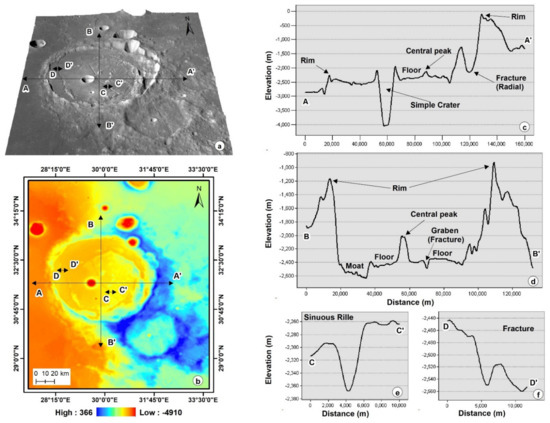The transition from the complex craters to peak-ring craters/basins involves the initial destruction and widening of the massive central peak [96]. The down and outward collapse of an unstable central massif uplift leads to the formation of a discontinuous central peak ring [97]. These regions have low density and low seismic velocity and extend to a certain depth beneath the surface [98,99]. A long sinuous rille of the volcanic channel is perceived in the Posidonius moat. It is named Rima Posidonius, and is 212 km in length, 0.77 km in width, and 96.13 m in depth, with a slope of 0.02 and sinuosity of 1.50 [100]. The sinuous rille formation mechanism is related to lava flow channels with levees of mechanical and/or thermal erosion [101,102,103].
