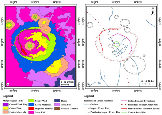 (a) Morphological map of the study area, modified after Fortezzo et al. 2020; (b) tectonic and linear features map of the Posidonius crater region using LRO LROC WAC and DEM data.