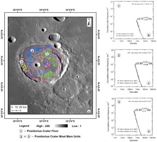 The Serenitatis impact event was a large impact event that occurred during the period of lunar heavy bombardment (LHB). Analysis of the Apollo 17 felsic clast of breccia rocks and age dating concluded that this impact event occurred at 3.87 ± 0.04 Ga [39]. The Serenitatis basin displays mass concentrations (Mascon) inside it and is filled with several series of magmatic activities [40,41,42,43]. In the present study, the CSFD-based crater age is determined for the Posidonius crater floor and two mare flow units. The Posidonius crater floor shows an age of 3.72 Ga. The Posidonius crater moat mare units show ages of 3.5 and 3.34 Ga (Figure 4). According to a new and updated lunar impact crater database by Losiak et al. (2009), the Posidonius crater belong to the upper Imbrian period [104,105], which is consistent with our results regarding the age estimation of the Posidonius crater.