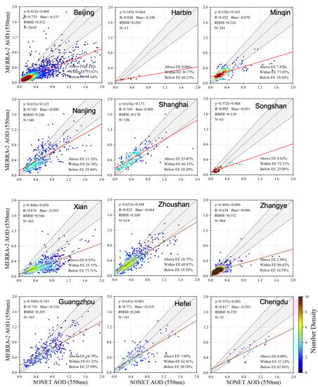 Validation of MERRA-2 AOD (550 nm) with SONET measurements at 12 sites over China. The grey dashed line represents the one-to-one line and EE line. The red solid line represents the linear fitting line.