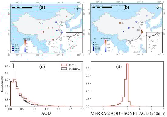 As shown in Figure 3d, the probability densities functions (PDFs), the AOD value of the MERRA-2 model is slightly lower than that of the SONET products, mainly concentrated in the range of +/−0.1, and the overall MERRA-2 is lower by 0.145 (Figure 3d). This may be due to the assimilated MODIS TERRA and AQUA AOD, which is proved to be underestimated in many studied over China [,].