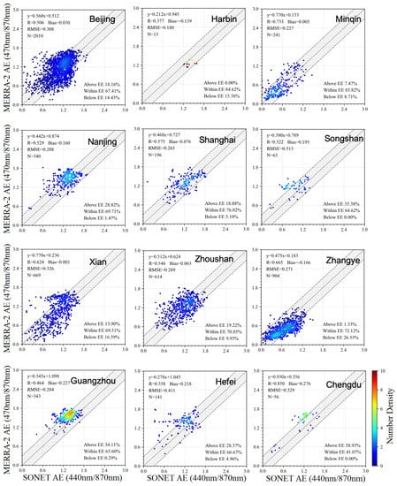 The validation results of MERRA-2 AE (440/870 nm) with SONET 12 sites are present in Figure 4. Generally, MERRA-2 AE show good performance with SONET ground-based measurements over all 12 sites. The MERRA-2 AE fits the one-to-one line for most of the sites. About 83.82% of matchup pairs are within the EE lines (+/−0.3) at Minqin site, where dust is the dominant source, and the correlation coefficient is 0.733, RMSE of 0.227, and bias of 0.005. In contrast, MERRA-2 AE is slightly overestimated at the Guangzhou urban site with high relative humidity. It may be due to the fact that there are high uncertainties in modeling anthropogenic aerosol sources and its hydroscopic growth. The MAE of AE that provides further quantitative illustration of the overestimation for fine mode aerosol particles at Guangzhou site. The MAEs over urban sites Nanjing, Shanghai, and Guangzhou are over 0.2. It implies that MERRA-2 tends to report smaller sizes of fine mode aerosols than SONET observations.
