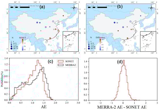 As shown in Figure 5a, the Chengdu and Guangzhou sites have higher AE (1.14 and 1.32), while Zhangye and Minqin sites have lower AE averages (0.55 and 0.66). As Figure 5b the Hefei and Chengdu sites have the largest MAE (both 0.30) for AE. Minqin has the smallest MAE (0.17). As Figure 5c shows the PDF of SONET and MERRA-2 AE, the statistical performance of the MERRA-2 is generally consistent with SONET (bias = 0.079). The PDFs of the AE difference (Figure 5d) show a normal distribution shape between −1~1.
