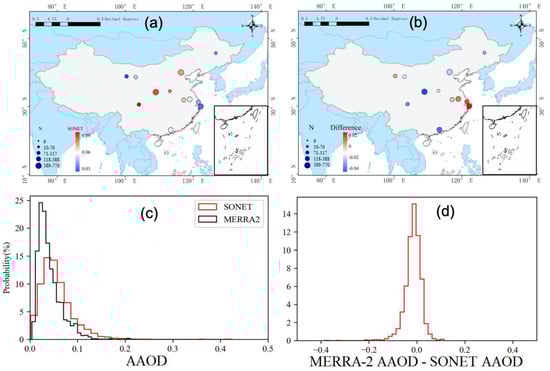 The results of AAOD show that the MERRA-2 AAOD are underestimated with SONET at 12 sites, R = −0.453–0.702 and RMSE = 0.014–0.058. The highest R is observed at basin site Chengdu (0.702), and the lowest R is at urban Harbin (−0.453). The Xi’an urban site is of the highest bias AAOD (−0.040). On the whole, MERRA-2 AAOD is generally more underestimated, about 0.008 over China.