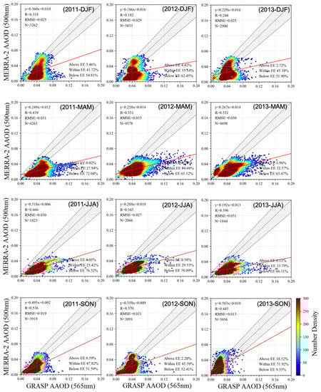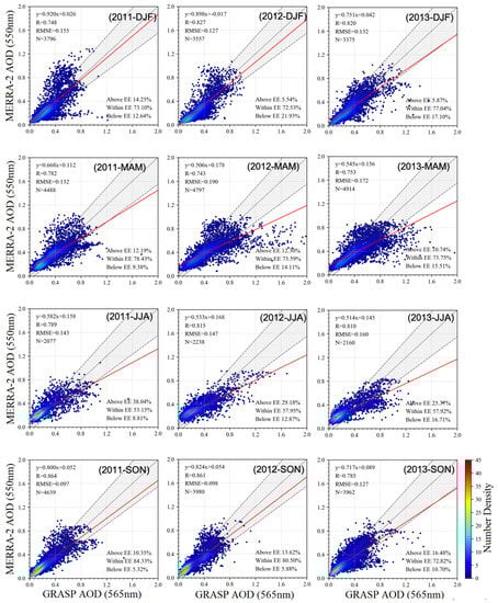 Figure 8 shows intercomparison of MEERA-2 seasonal AOD with PARASOL/GRASP over China. The results are presented season by season from 2011 to 2013. MERRA-2 shows good agreement with PARASOL/GRASP seasonal AOD, the correlation coefficient is at least 0.7 and RMSE is smaller than 0.16. The R is highest (0.864) in Autumn 2011, and it is smallest (0.743) in Summer 2012. In particular, the within EE of SON (Autumn) is relatively high, ranging from 72% to 84% in three years. From 2011 to 2013, both MERRA-2 and PARASOL/GRASP show slightly increasing AOD trends over China (Table 3). With the increase in AOD, MEERA-2 seems to show more pixels below EE with PARASOL/GRASP. Especially in 2013 MAM, MERRA-2 below EE fraction is approximately 15.5% with respect to PARASOL/GRASP products. The maximum value below EE fraction is in 2012 DJF Winter (21.93%).