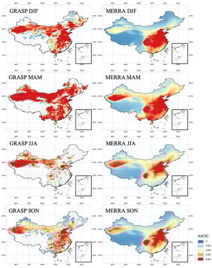 The statistics mean of the seasonal values for MERRA-2 and GRASP from Jan 2011 to Dec 2013.